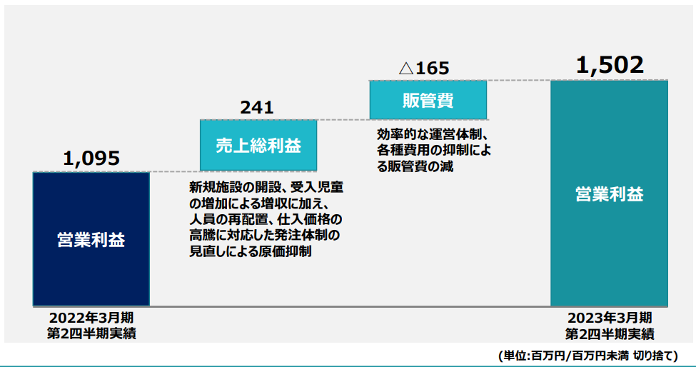新規施設の開設及び既存施設の受入児童数増による売上拡大に加え、各施設での人員の再配置による運営の効率化、仕入価格の高騰に対応した発注体制の見直しなどにより、前期特殊費用の要因はあるものの、前期と比較して大幅な増益となっています。