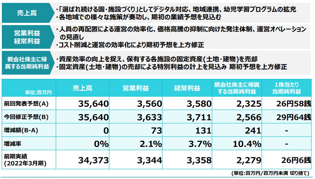 コロナ禍においてデジタルを活用した園見学や英語・体操・リトミック・ダンスなどのオンラインプログラムの実施、新たな幼児学習プログラムの導入など、「選ばれ続ける園・施設づくり」の取り組みによる既存施設の受入児童の増加及び新規施設の開設により増収となっています。