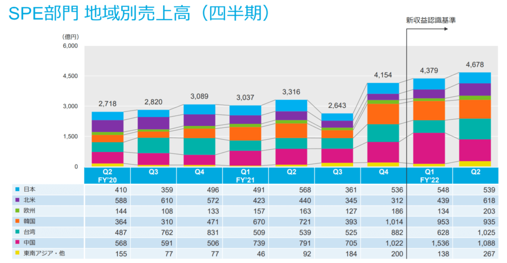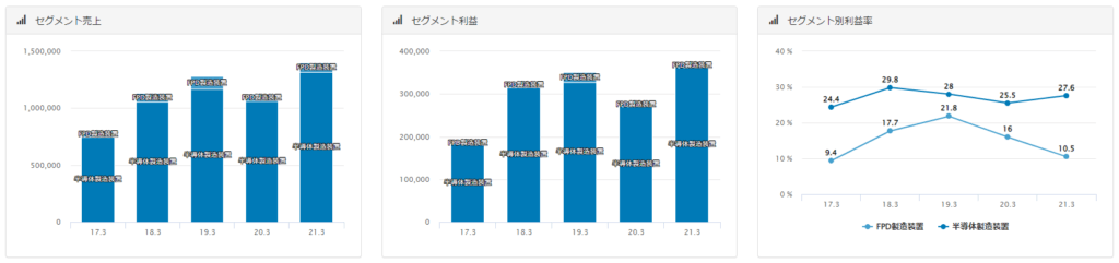 地域別にみると中国での売り上げは2020年3月期249,234百万円であったのに対して、2021年3月期は398,491百万円と急増しており、中国の半導体国産化の恩恵を受けていることがわかります。