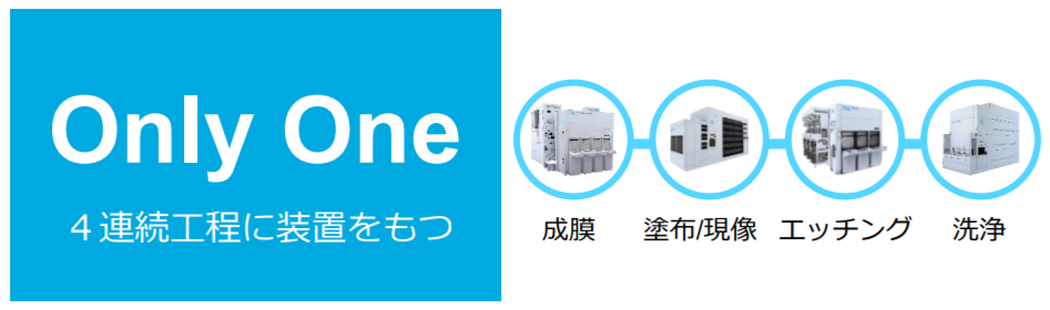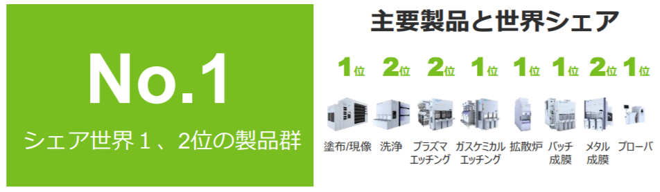 | 日SCREEN HD | 2,304億円 | 161億円 | ウエハー洗浄装置など世界シェア首位級の製品を多数保有 【主な製品】ウエハー洗浄装置、コータデベロッパー |