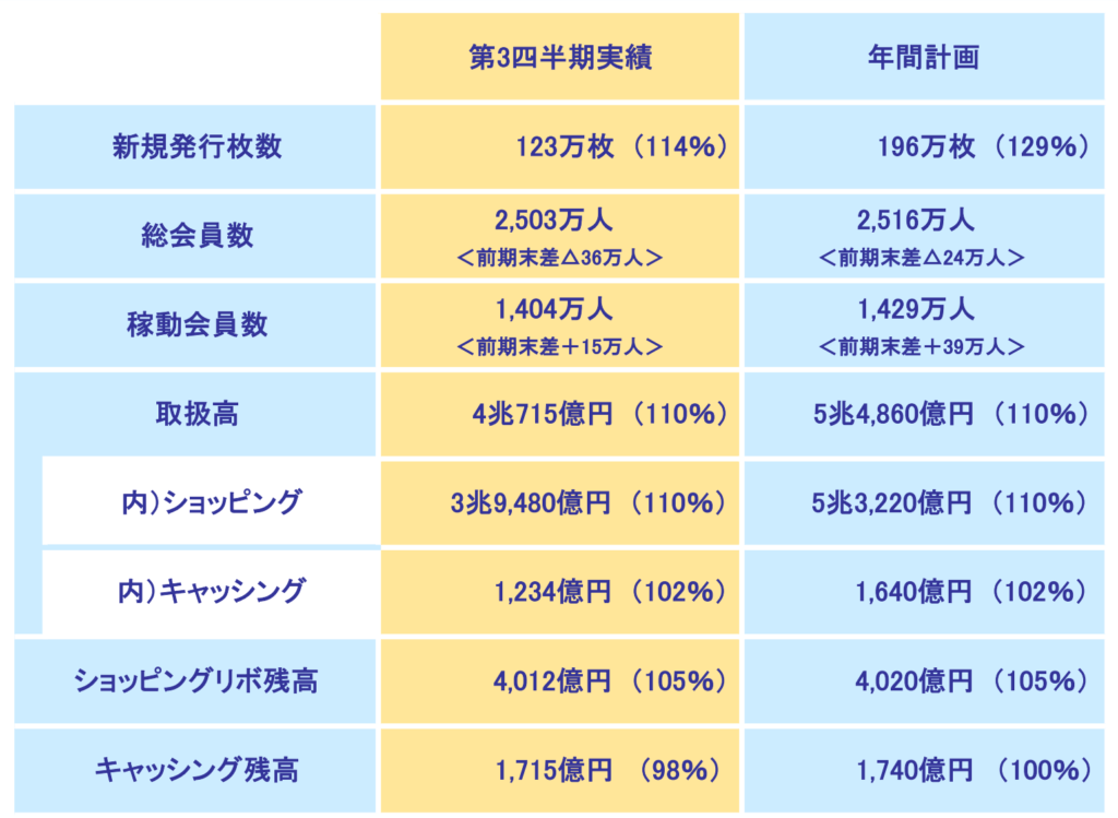 新規カード会員数は123万人(前年同期比13.6%増)、カード会員数は2,503万人(前期末比1.4%減)、カードの年間稼動会員数は1,404万人(前年同期比1.2%増)となっています。