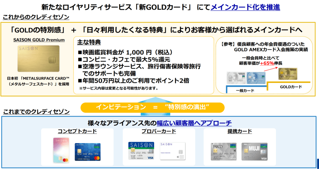 「ワンランク上のカード”SAISON AMEX”」のイメージとプロダクト確立に向けた「AMEX戦略」とメインカード化を推進する「新GOLDカード戦略」を中核に、新たなモデルを確立していく。