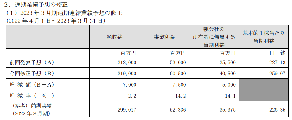 2022年11月10日、2023 年3月期第2四半期の短信発表時点で通期業績予想の上方修正を実施しています。