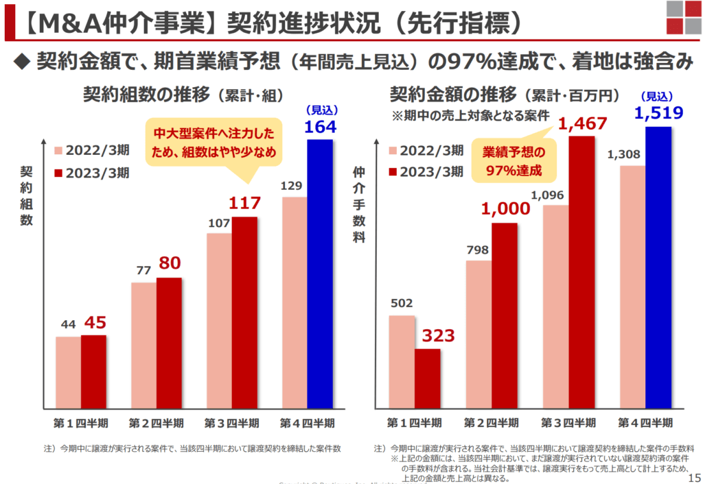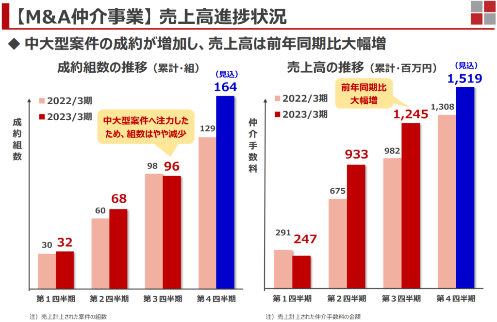 また、M&A仲介事業については、主な収入である仲介手数料が成約組数×手数料単価となり、手数料単価に大きな変動がないため、成約組数を重要な経営指標としています。