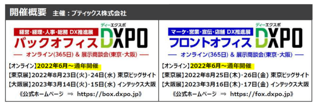 | ハイブリッド展示会事業 | 主に、IT業界へ向けたハイブリッド展示会の開催を行う。 「バックオフィスDXPO」は、企業の管理部門向けの業務改革・生産性向上を支援するソリューション・サービスを一堂に集めたハイブリッド展示会。 「フロントオフィスDXPO」は、顧客と接点を持つ営業・マーケティング部門や小売店等に向け、売上増を支援する各種ソリューション・サービスを一堂に集めたハイブリッド展示会。 |