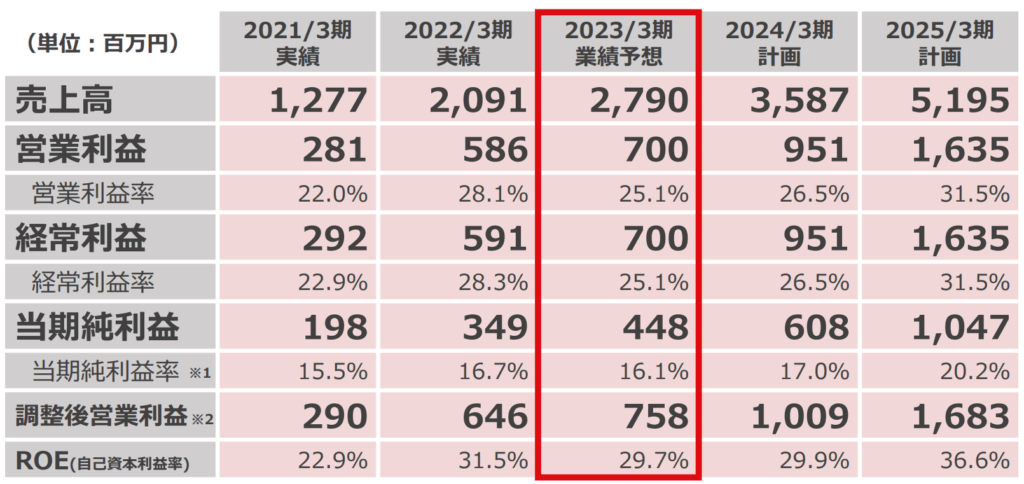 2023年3月期2Qは、売上高は19.2億円(前年同期比+45.4%増)、営業利益は5.8億円(前年同期比+55.9%増)、親会社株主に帰属する当期純利益は3.4億円(前年同期比+61.2%増)となりました。