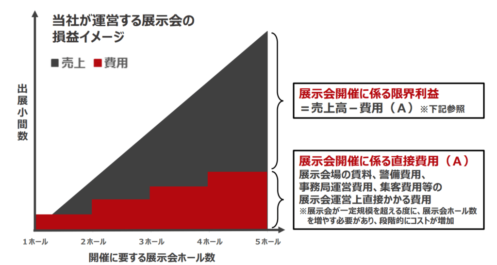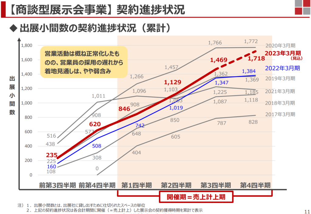 事業別には、商談型展示会事業については、主な収入である出展料が出展小間数×小間単価となり、小間単価に大きな変動がないため、出展小間数(出展社に貸し出すために仕切られたスペースの単位)を重要な指標としています。