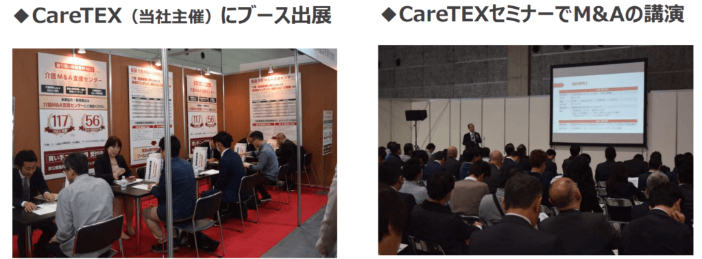 介護・健康施術業界において新規参入や業容拡大を図る各種サプライヤーと、高齢者施設等の新設・修繕等を検討する介護・健康施術事業者とを一堂に集めて商談を促進する場を提供する商談型展示会の開催や、介護・福祉業界における事業承継ニーズに応えるM&A仲介サービスを営んでいます。
