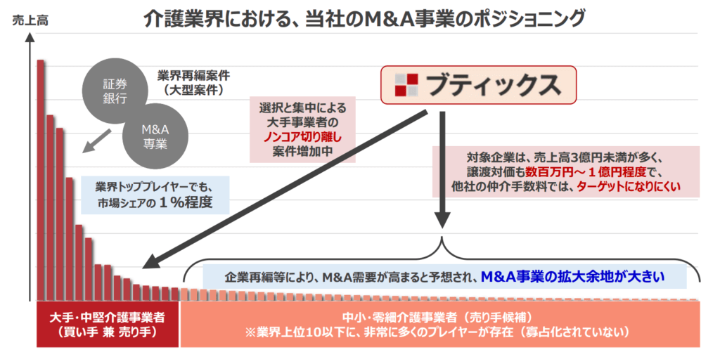 2023年1月に介護事業者等の経営⽀援・事業承継⽀援の強化するために、ブティックスとSOMPOケアがそれぞれ展開する介護事業者向けサービスを活⽤した相互送客を目的とする業務提携をするとリリースしています。