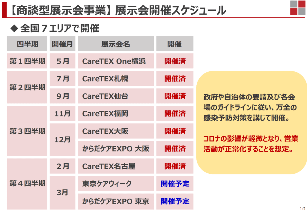 商談型展示会事業につきましては、「CareTEX」、「からだケアEXPO」及び商品ジャンル特化型展示商談会「CareTEX One」を、東京都、大阪府、福岡県、宮城県、愛知県、神奈川県、北海道の全国合計7エリアでの開催に向け、万全の感染予防対策を講じた上で、来場者及び出展社への販促活動を行ってまいりました。