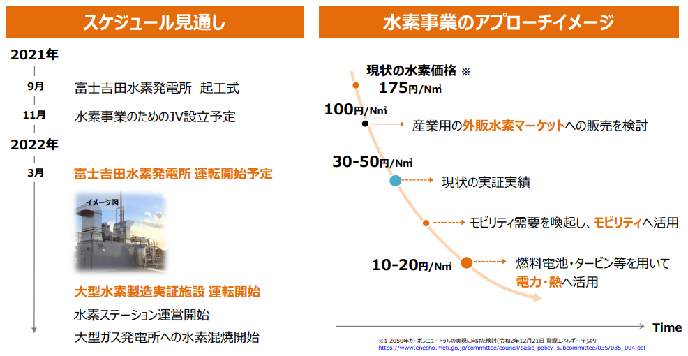 今後大型の水素製造実証施設を建設・運転し、最終的には水素ステーションの運営や大型ガス発電所への水素混焼の青写真を描いている点について期待してしまいます。